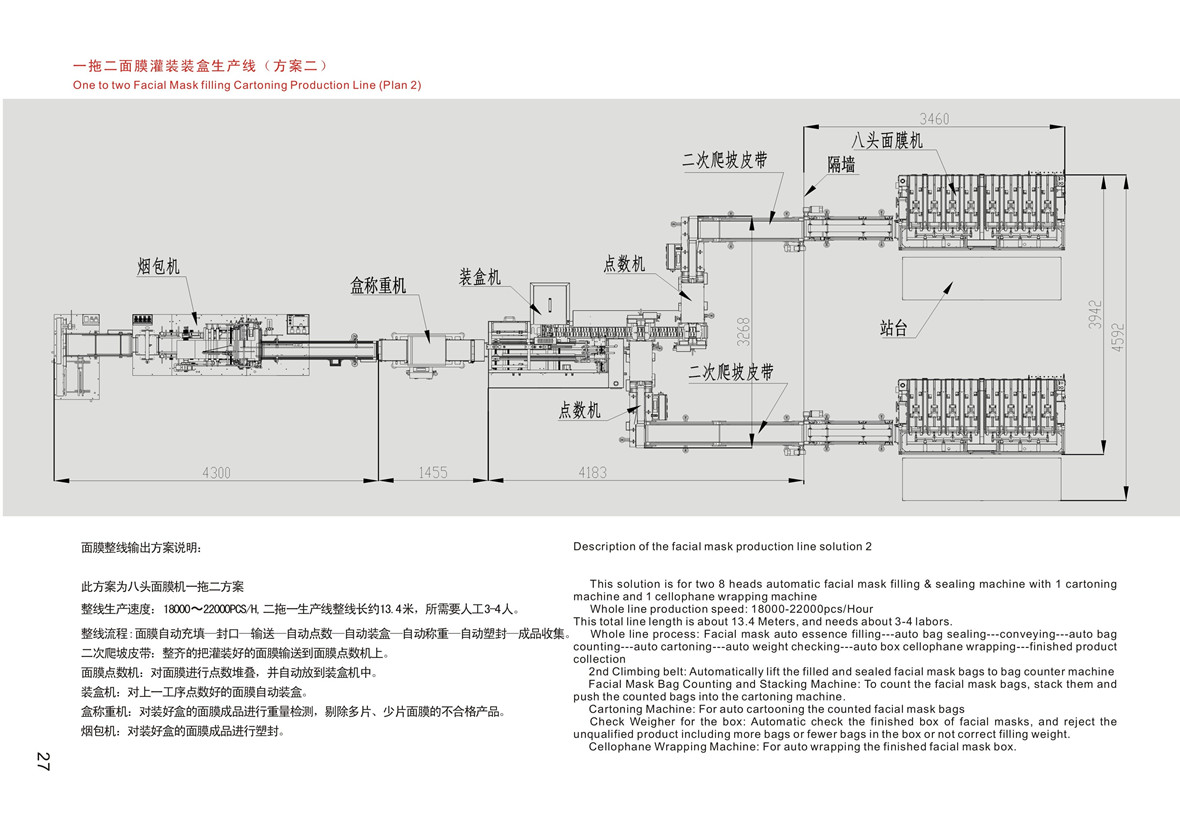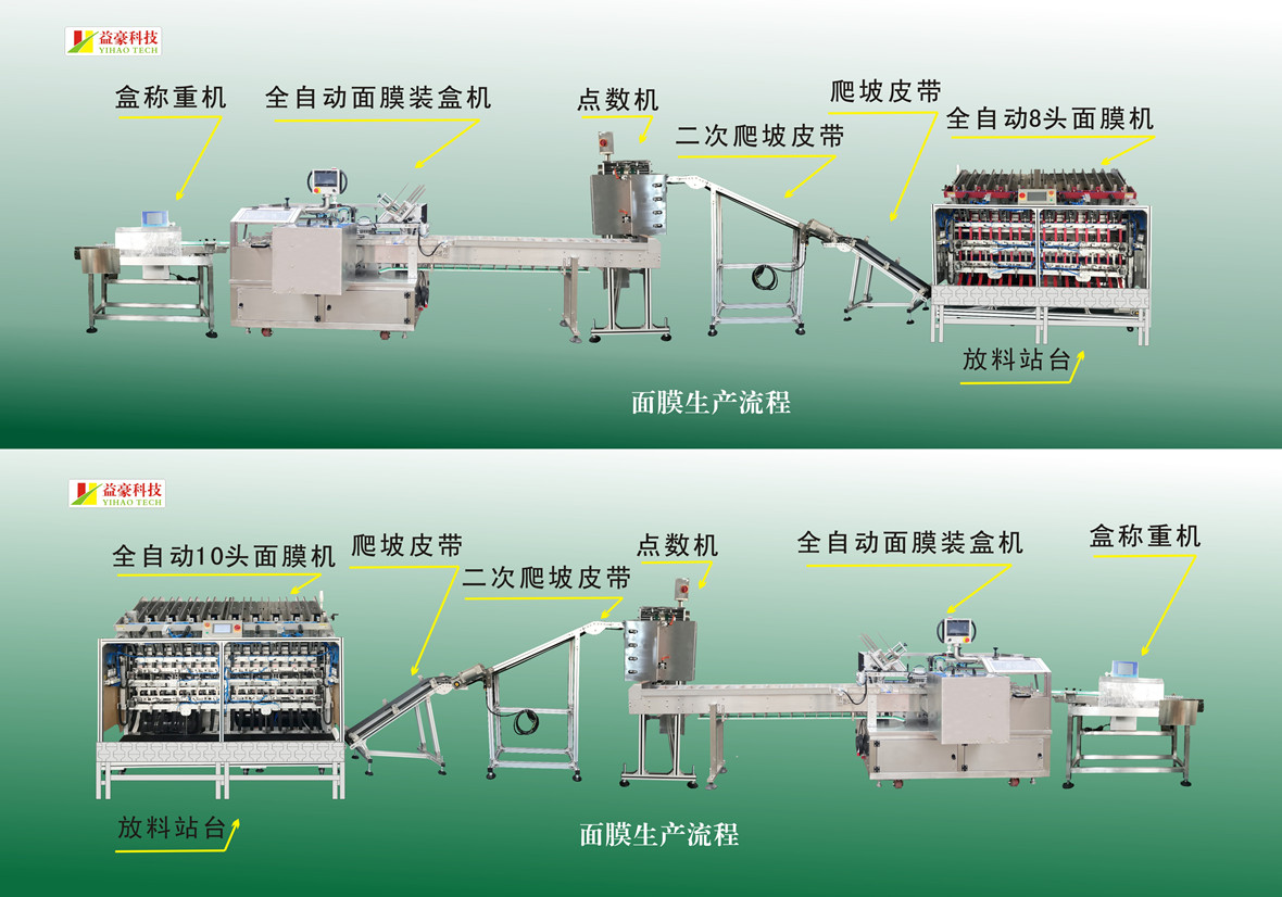 整線流程:面膜自動充填一封口一輸送一自動點(diǎn)數(shù)-自動裝盒-自動稱重一自動塑封一成品收集,二次爬坡皮帶:整齊的把灌裝好的面膜輸送到面膜點(diǎn)數(shù)機(jī)上。面膜點(diǎn)數(shù)機(jī):對面膜進(jìn)行點(diǎn)數(shù)堆疊,并自動放到裝盒機(jī)中。裝盒機(jī):對上一工序點(diǎn)數(shù)好的面膜自動裝盒。