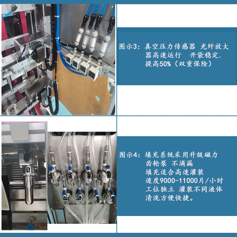 2.1、自動下袋、自動填充、自動封口、成品輸出、自動計數,無袋不充填,無袋不封口;