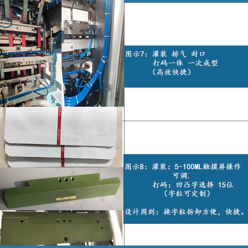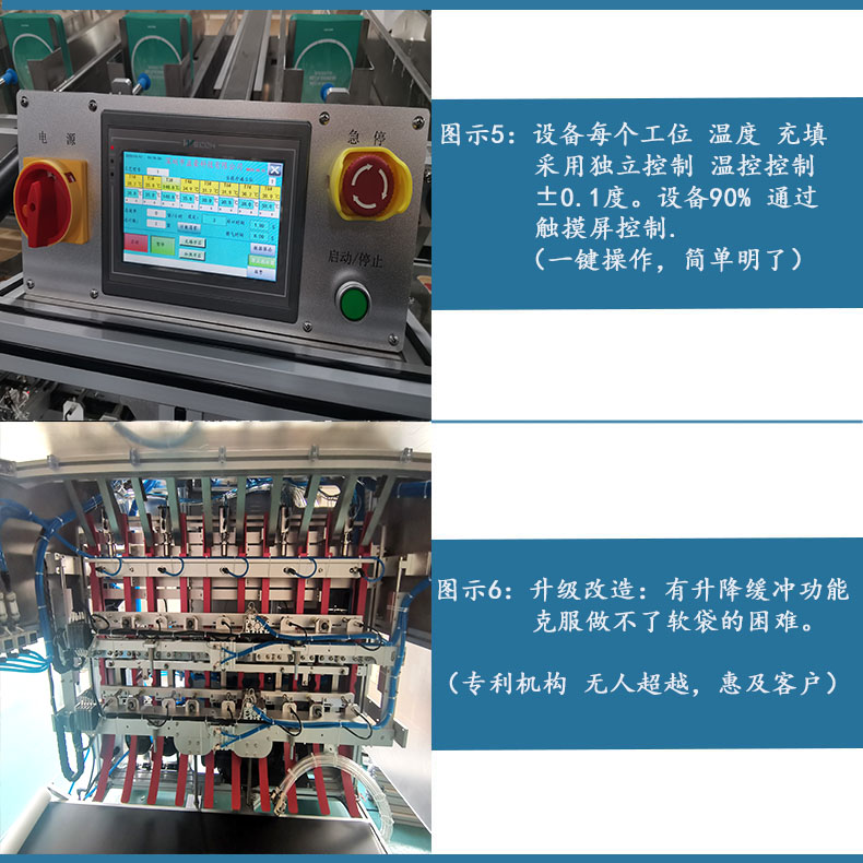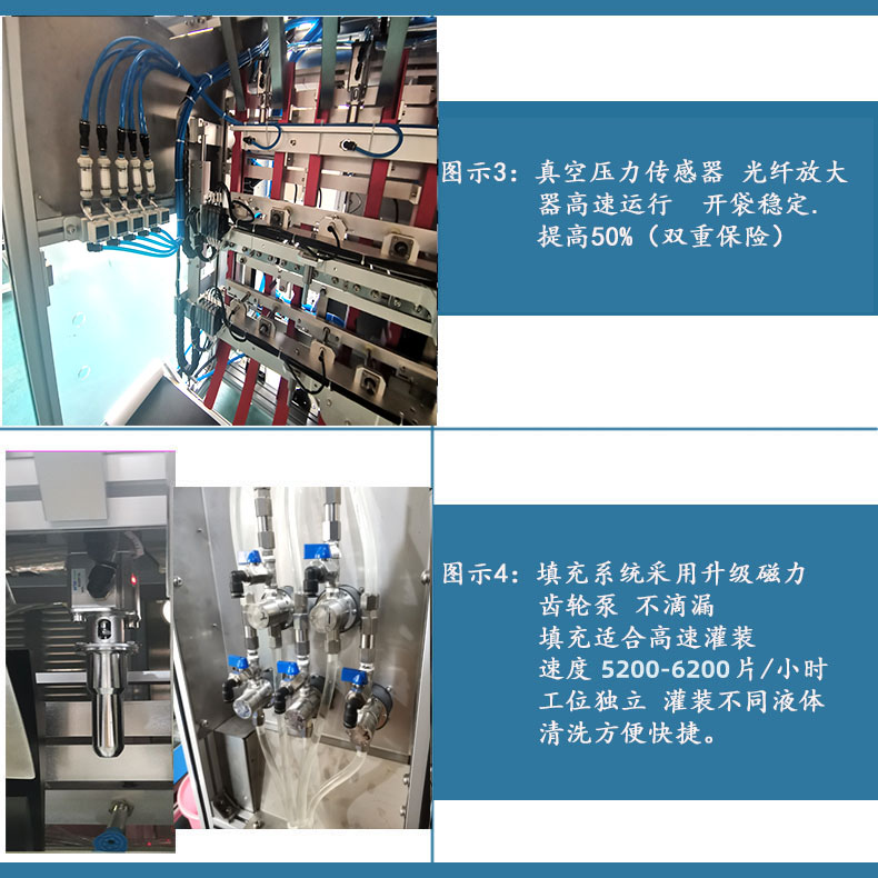 1、自動(dòng)下袋、自動(dòng)填充、自動(dòng)封口、打碼、成品輸出、自動(dòng)計(jì)數(shù),無袋不充填,無袋不封口;